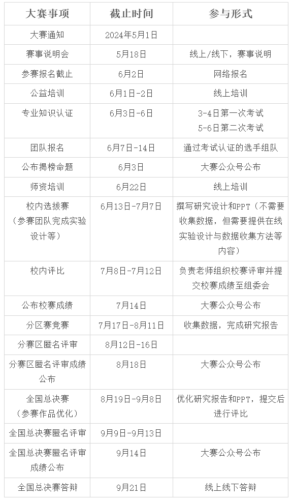 3.全国总决赛(8月19日—9月21日):进入全国总决赛的团队,需要根据分赛区评审结果对研究报告进一步完善后提交至全国总决赛评审委员会。进入全国总决赛的团队将采取线上线下相结合的形式进行展示与答辩,评出全国总决赛一、二、三等奖。