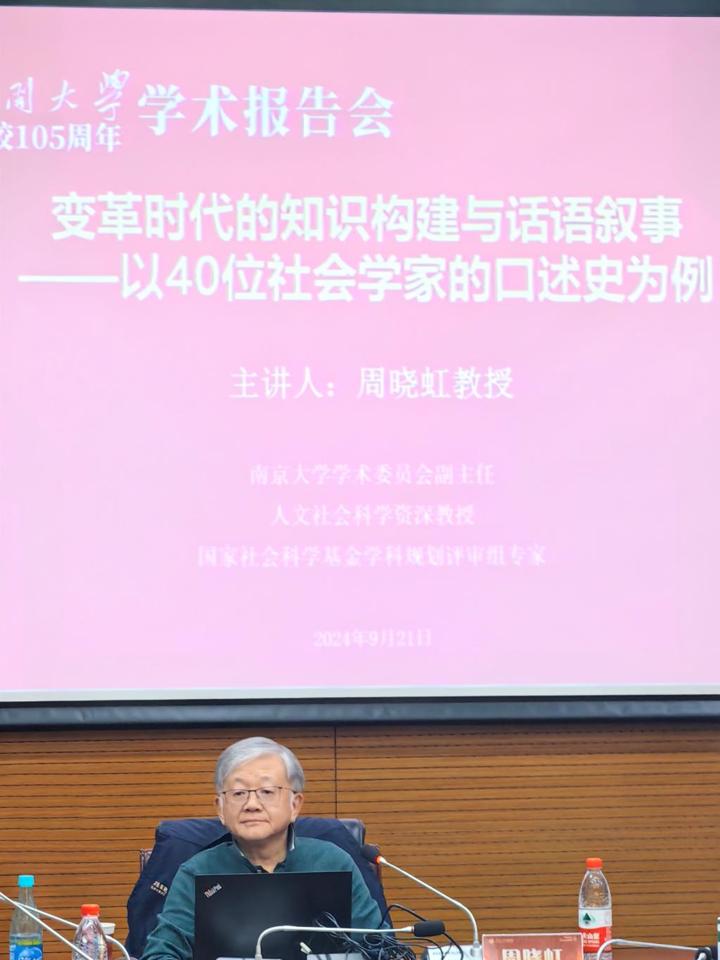 2024年9月21日,Beat365唯一官方网站举办了庆祝Beat365唯一官方网站建校105周年的学术报告会。受Beat365唯一官方网站邀请,南京大学学术委员会副主任、人文社会科学资深教授、教育部领军人才项目特聘教授、国家社会科学基金学科规划评审组专家周晓虹教授进行了一场学术讲座。他以“变革时代的知识建构与话语叙事——以40位社会学家的口述史为例”为主题,深度剖析了中国社会学人致力于社会学中国化的不懈努力,特别是现代化浪潮下中国社会学发展进程中的现实基础和文化自觉。讲座由Beat365唯一官方网站吴帆教授主持,学院师生近百人参加,全场座无虚席。