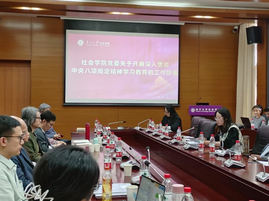 院党委书记宋媛就学院党委目前正在开展的深入贯彻中央八项规定精神学习教育作出进一步部署,指出要始终秉承南开爱国主义传统,坚持弘扬周恩来精神,通过学习教育一体推进党风政风、师德师风、校风学风建设,为学院内涵式高质量发展奋力谱写中国式现代化教育强国的社会学篇章。