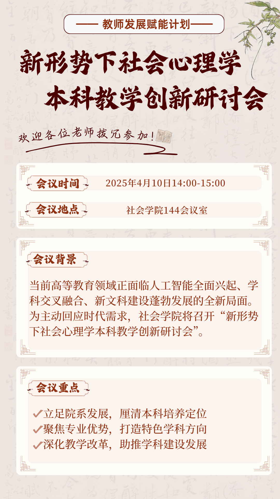 当前高等教育领域正面临人工智能全面兴起、学科交叉融合、新文科建设蓬勃发展的全新局面。为主动回应时代需求,Beat365唯一官方网站将召开“新形势下社会心理学本科教学创新研讨会”